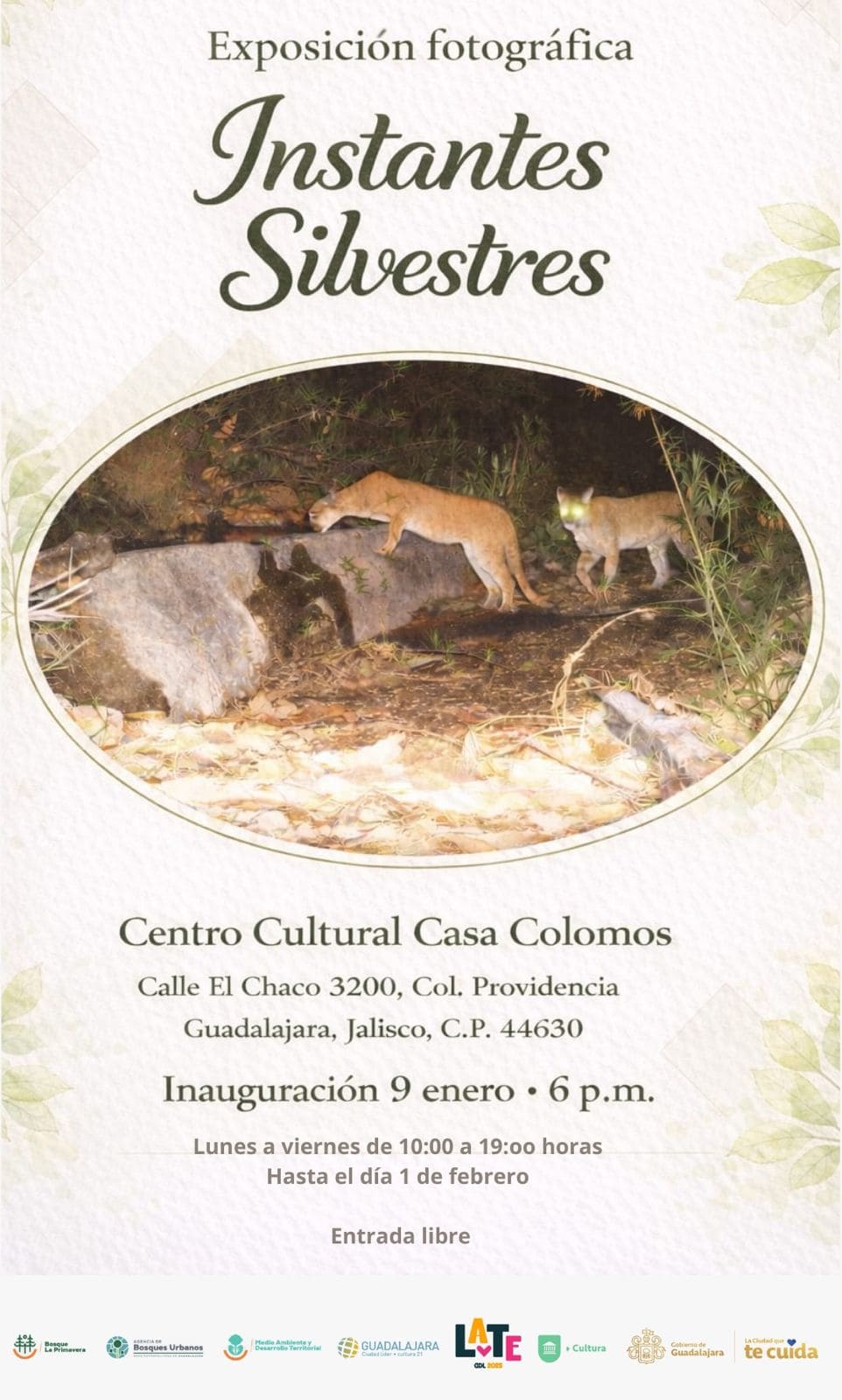 eneINSTANTES SILVESTRESEvento de un mes de duranción (Enero)(GMT-06:00) Bosque Los Colomos (El Castillo), C. El Chaco 3200, Providencia, 44630 Guadalajara, Jal. Organizador: Bosque de la Primavera